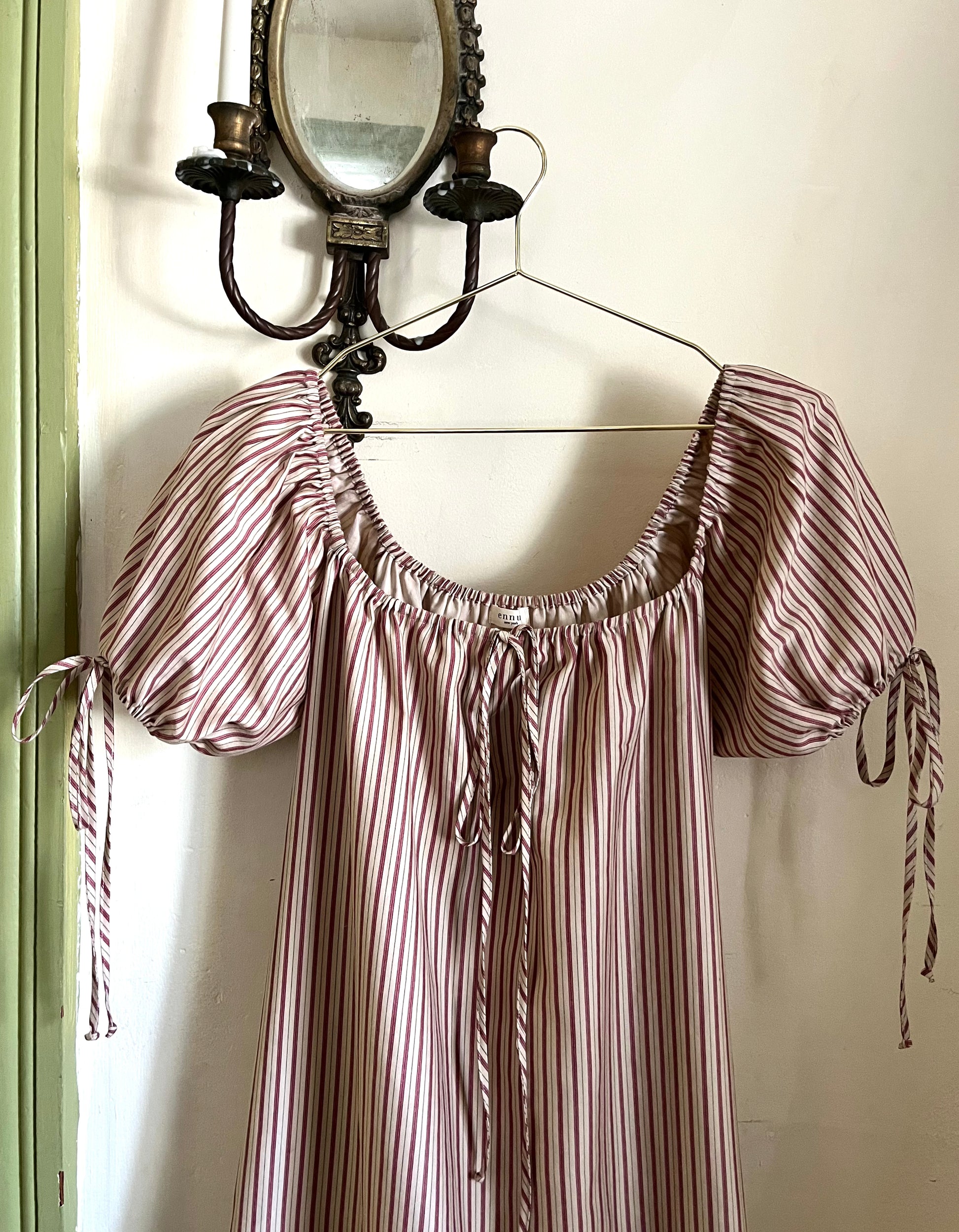 Handcrafted from repurposed vintage Ralph Lauren bed linens, the Millie Housedress features an adjustable elastic square neckline, romantic puffed sleeves, ruffled hem, and a breezy effortless silhouette. Featuring a functional slender neck and sleeve ties allowing you to adjust the fit, as well as pockets to store all your little somethings — wear on or off-the-shoulder. The Millie Housedress rendered in our French Stripe cotton — soft girl autumn is here. Pairs beautifully with your favorite lofty sweater and boots. Meticulously finished with french seams and classic garment making techniques — as beautiful on the inside as it is out. Unlined.