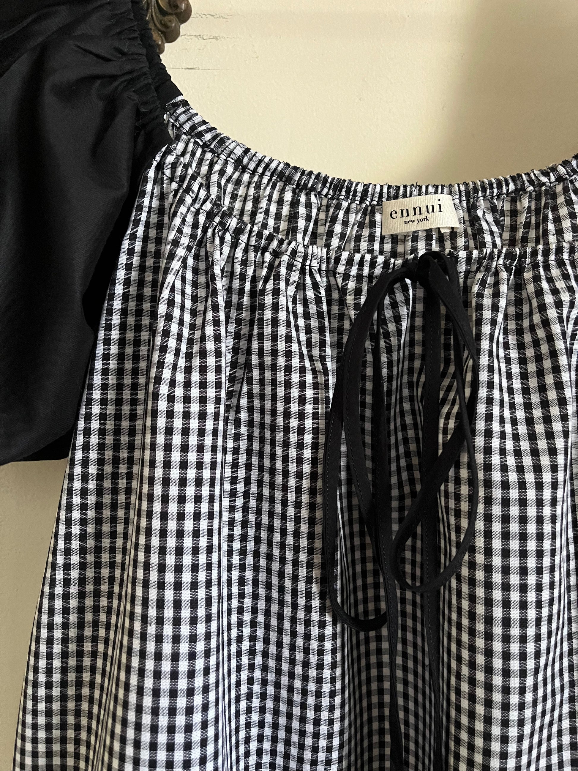 - fabric: 100% Organic cotton in Noir Gingham mixed with contrast Noir cotton voile sleeves