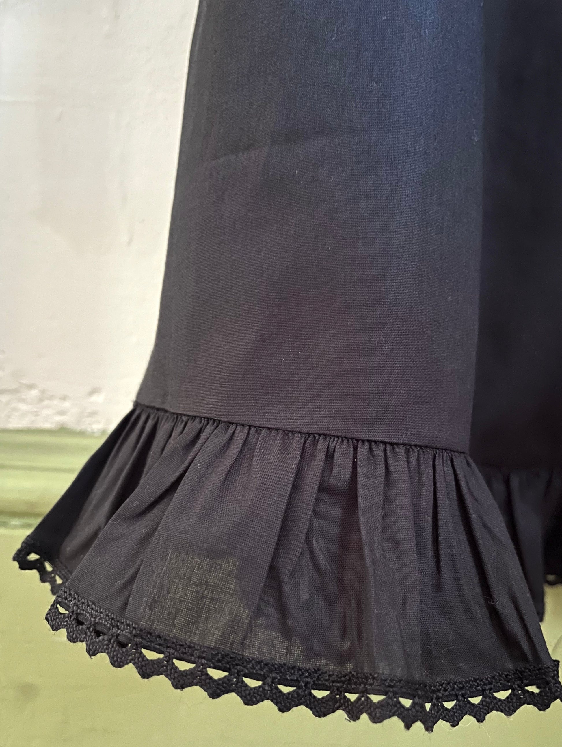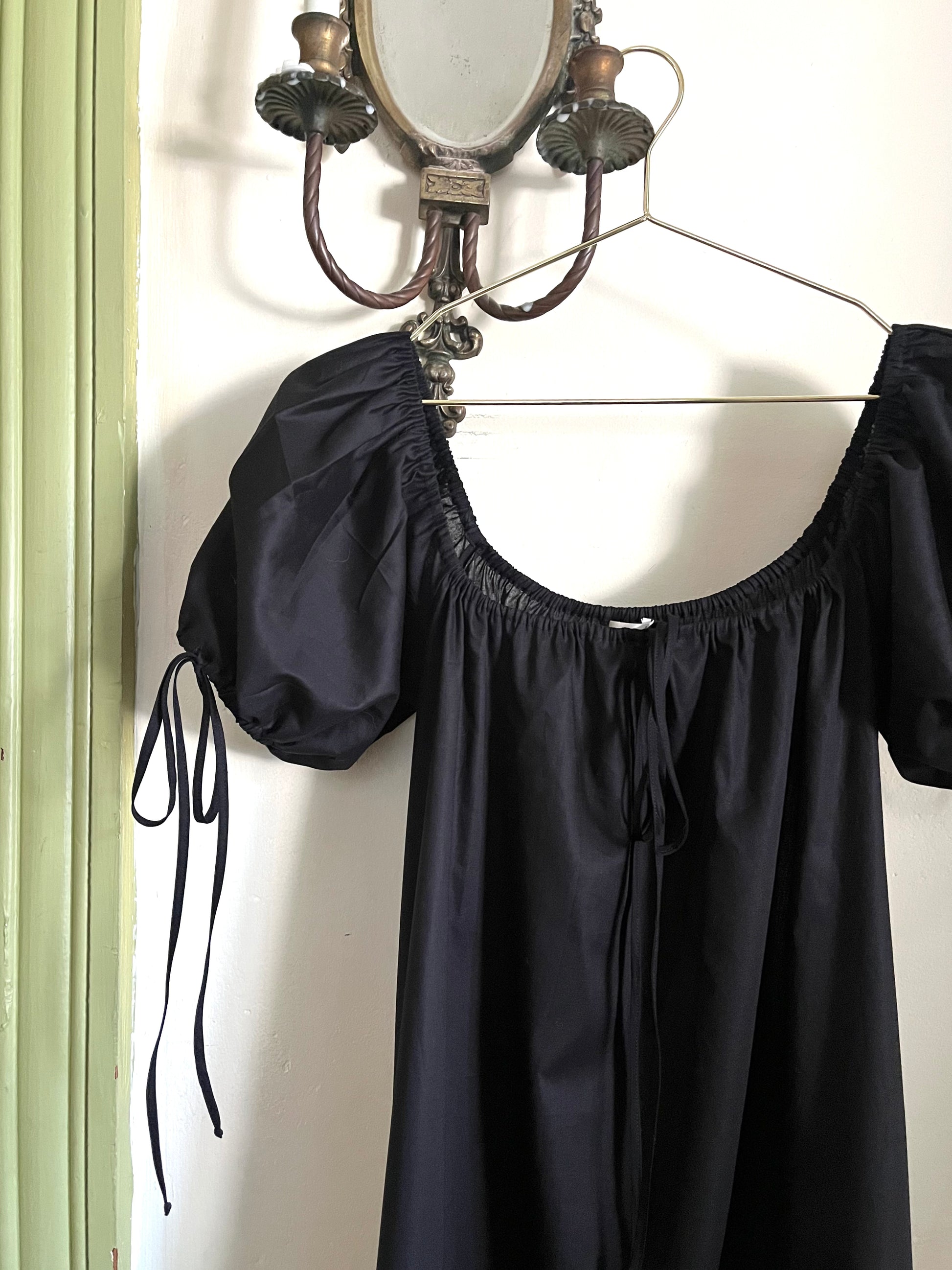 Handcrafted from organic cotton voile in Noir, the Millie Housedress features an adjustable elastic square neckline, romantic puffed sleeves, ruffled hem with delicate lace trim, and a breezy effortless silhouette. Featuring a functional slender neck and sleeve ties allowing you to adjust the fit — wear on or off-the-shoulder. The Millie Housedress rendered in our Noir organic cotton voile — soft girl autumn is here. Pairs beautifully with your favorite lofty sweater and boots. Meticulously finished with french seams and classic garment making techniques — as beautiful on the inside as it is out. This fabric is slightly sheer and unlined.
